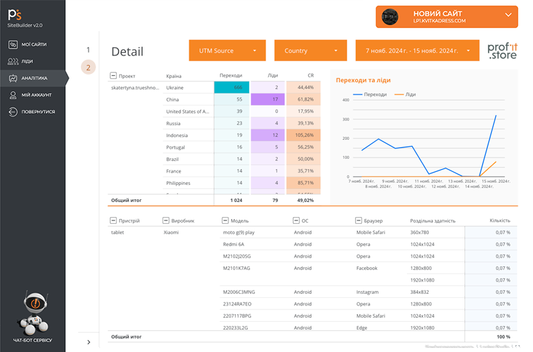 Дашборд деталізації трафіку надає повну інформацію про географію користувачів, типи пристроїв, операційні системи, браузери та роздільну здатність екранів. Цей інструмент дозволяє глибше розуміти аудиторію та адаптувати рекламні стратегії відповідно до характеристик користувачів для максимального результату.