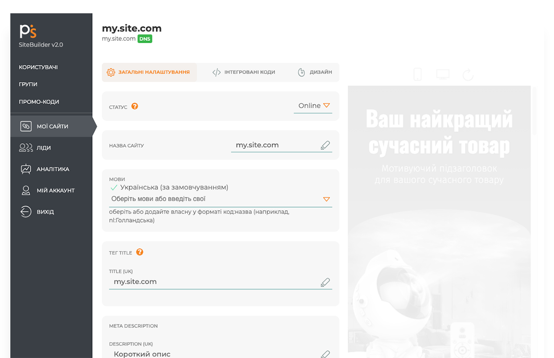 Все просто для швидкого старту! Зареєструйтеся, увійдіть у бек-офіс, налаштуйте лендінг за хвилини без програмування — інтуїтивний інтерфейс і готові шаблони дозволяють запустити сайт за 4 кроки, ідеально для новачків та швидких кампаній.